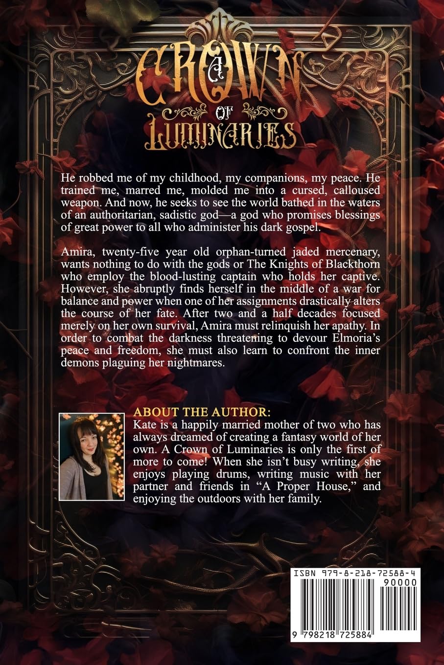 Amira, twenty-five year old orphan-turned jaded mercenary, wants nothing to do with the gods or The Knights of Blackthorn who employ the blood-lusting captain who holds her captive. However, she abruptly finds herself in the middle of a war for balance and power when one of her assignments drastically alters the course of her fate. After two and a half decades focused merely on her own survival, Amira must relinquish her apathy. In order to combat the darkness threatening to devour Elmoria's peace and freedom, she must also learn to confront the inner demons plaguing her nightmares.